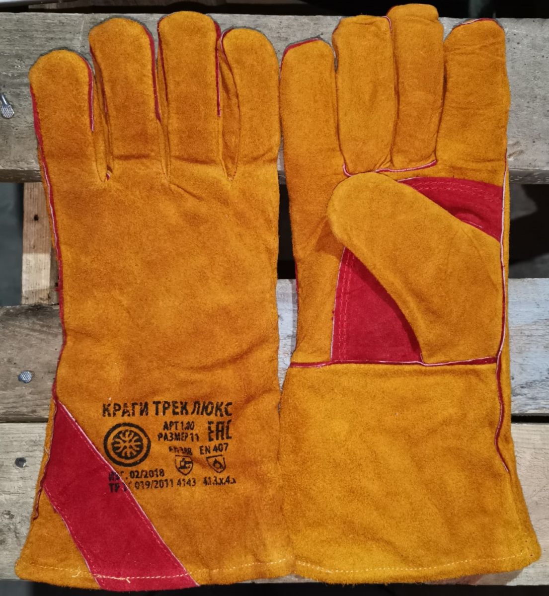 У краг спилковых ТРЕК используется спилок КРС однородный, 1,2+/-0,1 мм, шлифованный, окрашенный. Швы усилены вставками из кожи черного цвета. Краги обеспечивают высокую механическую защиту, защиту от повышенных температур - открытого пламени, искр и брызг расплавленного металла. Наличие подкладки из искусственного меха повышает комфорт использования и позволяет использовать краги в зимнее время.